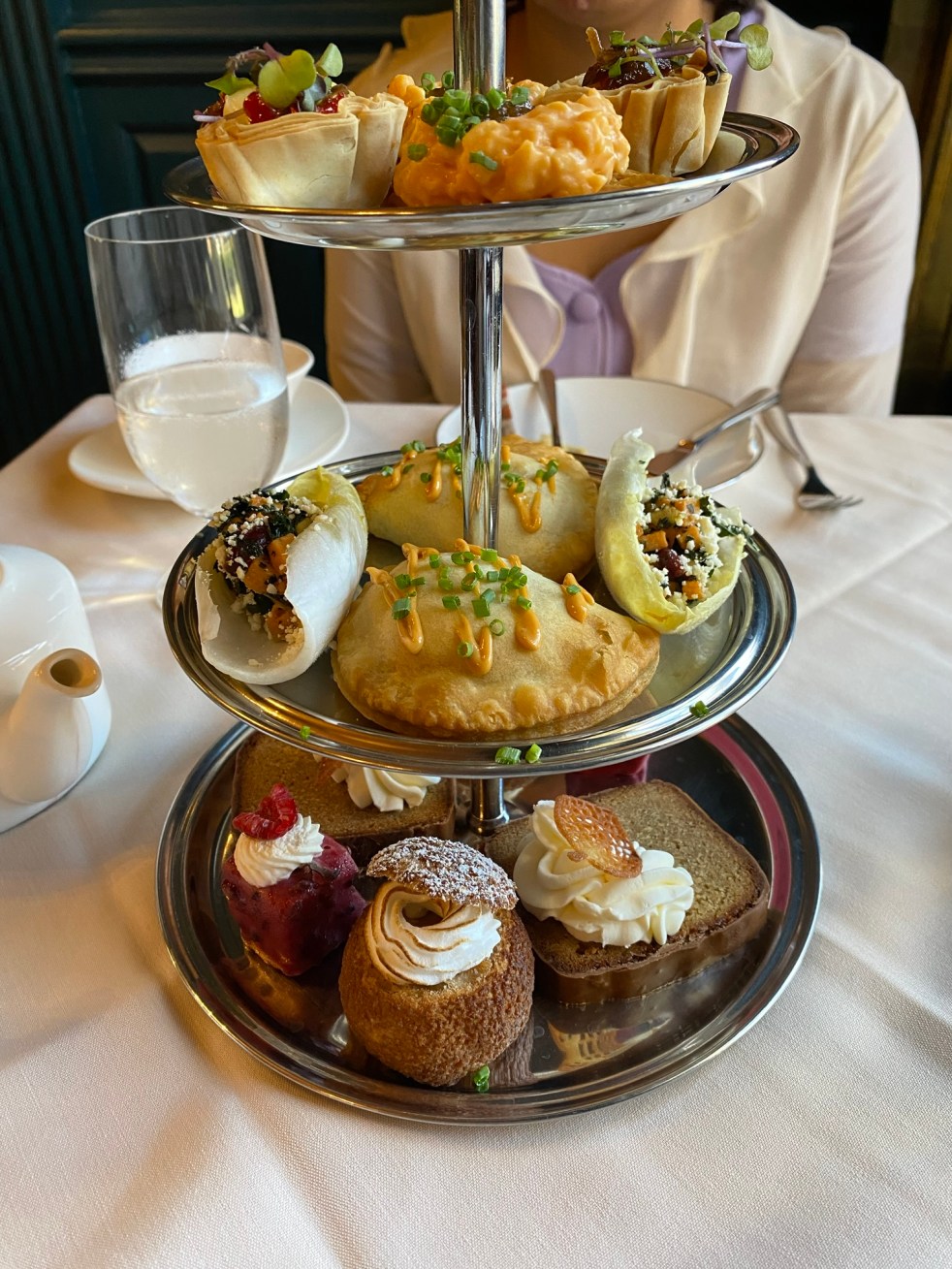 Our food arrived and it was an impressive presentation. We started our meal with the fried saltines and pimento cheese savory bites (the top level). Rich, a little salty, and a lot crunch, these delicious cheesy bites were perfectly balanced by the tomato conserva garnish, which left a little sweetness and brightness after each bite. We followed up with the baked brie bites (top level), which had little bits of mushroom, pepper jelly, and a sprig of micro greens on top. This is a nice, standard tea dish: soft baked cheese in phyllo dough, with a few other ingredients for more flavor and texture. This is one that would be fairly easy to recreate at home, and would be a tasty hit with your guests!