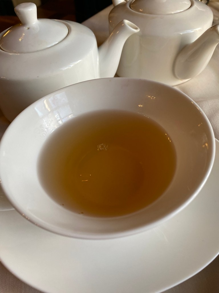 We were brought a basket of biscuits and scones, along with jam and butter. These were tasty, and a great way to start our tea. The scones featured a swirl of additional flavoring (I don’t know what it was: the items were brought to us while I washed my hands, and I forgot to ask our waiter about it). The scones were softer and sweeter than the biscuits, and both were perfect with our first two pots of tea.