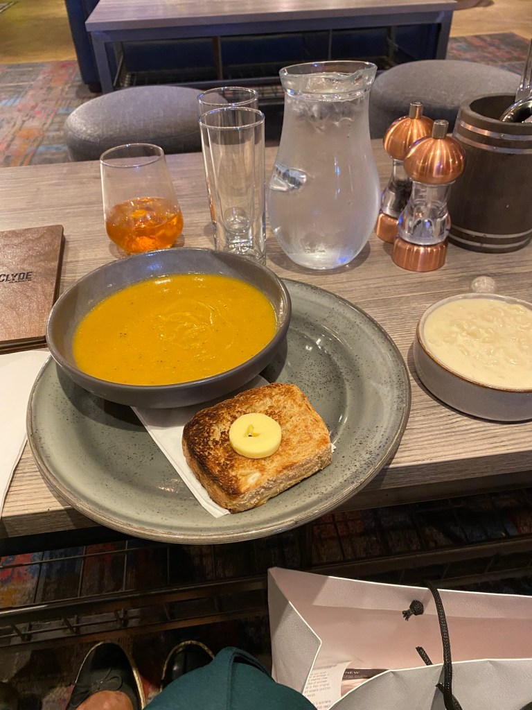 Before we walked the final block to our hotel, we stopped off at the DoubleTree by Hilton to check out their restaurant, Cask & Clyde. The menu had a fair amount of options, and I found a couple of things that looked good (namely, the soup of the day – lentil – and macaroni and cheese). I also enjoyed an old fashioned while I waited for my food.