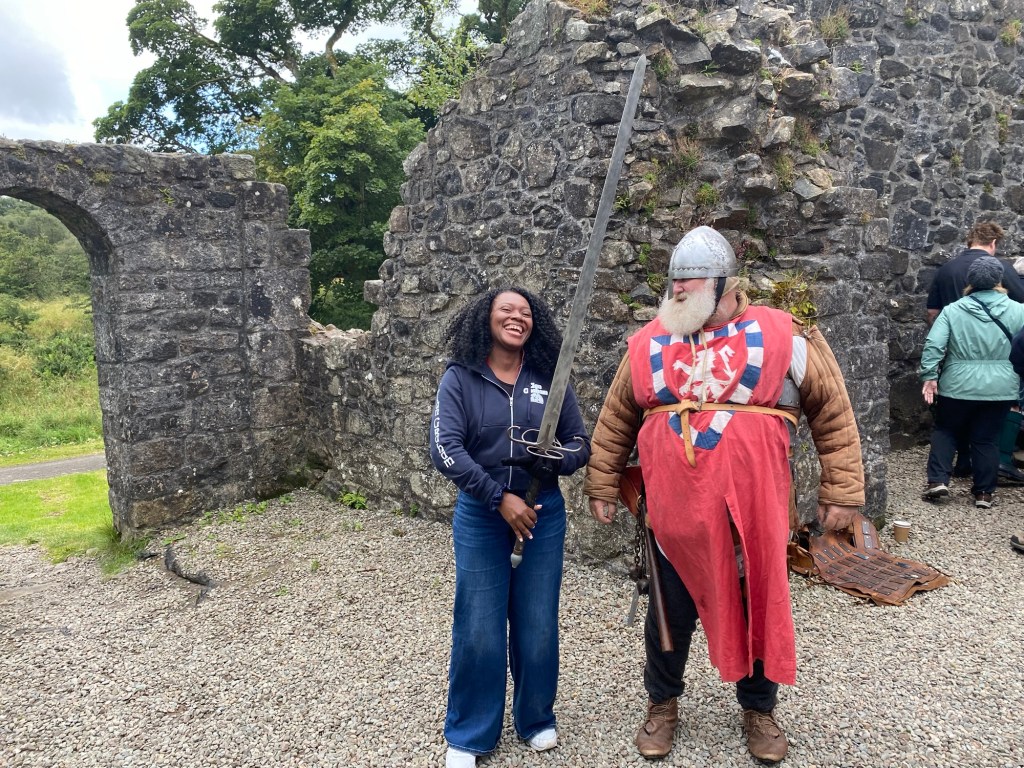 Chuckling with the professional actor outside of Mugdock Castle
