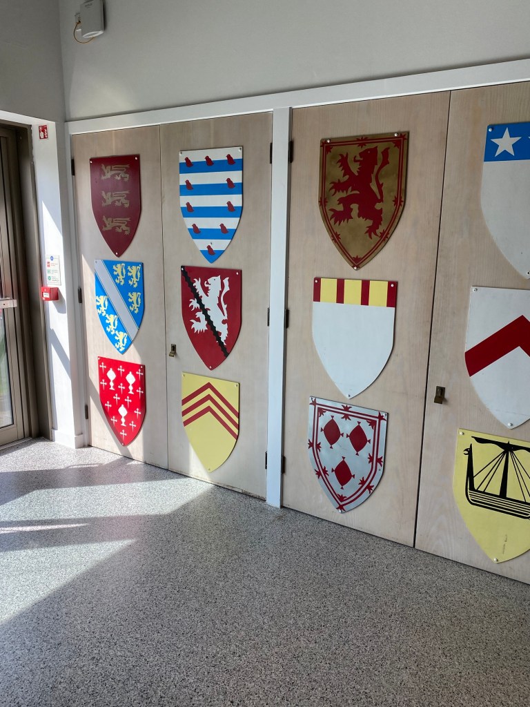 Crests in stained glass in the meeting area for the Order of the Thistle