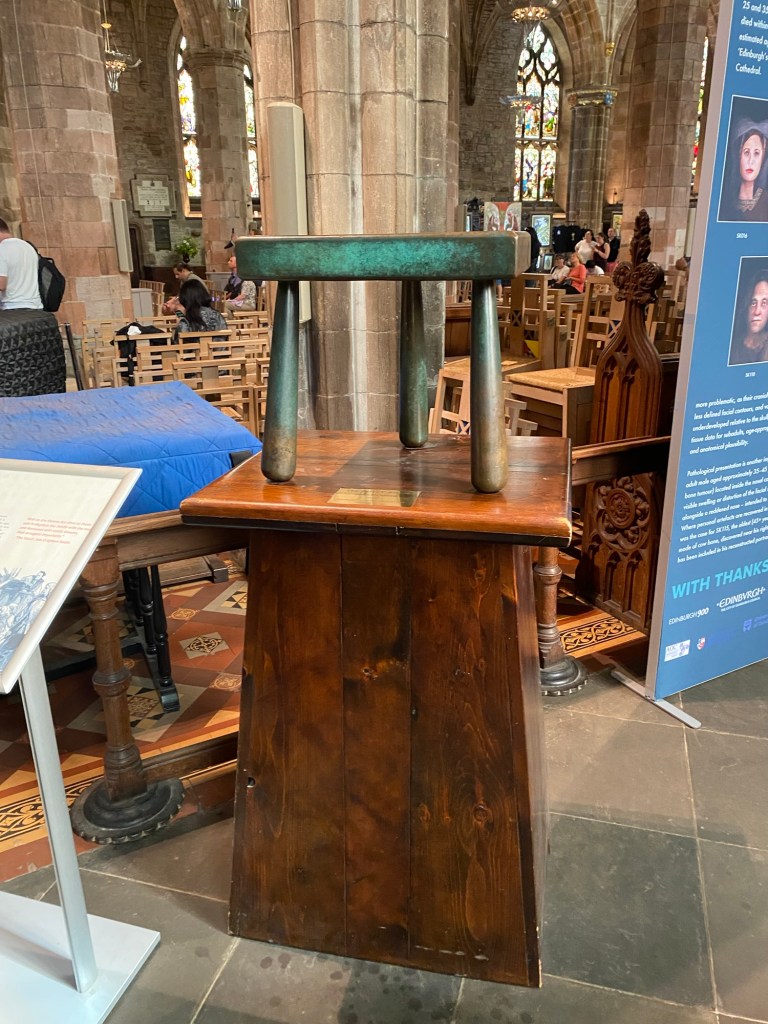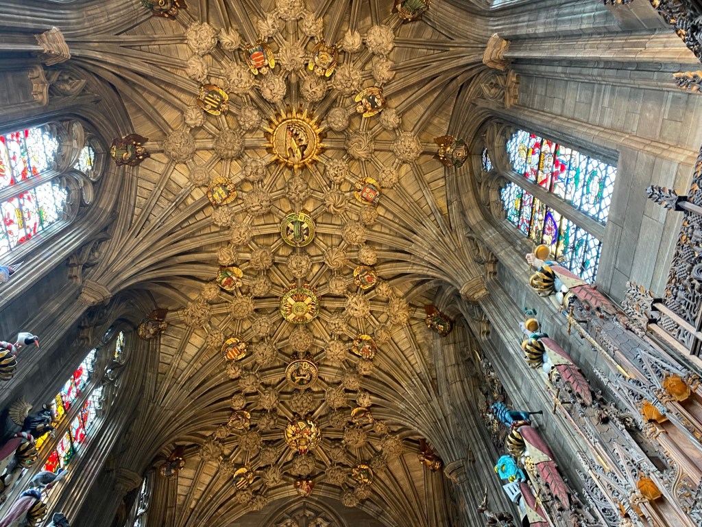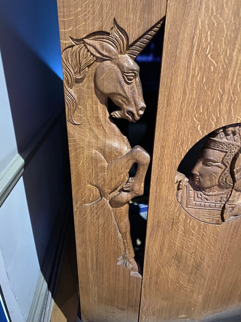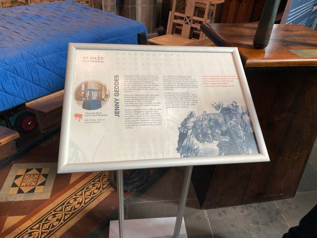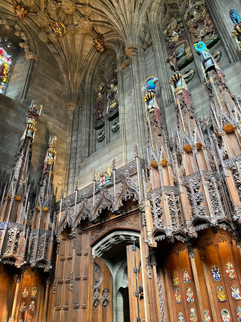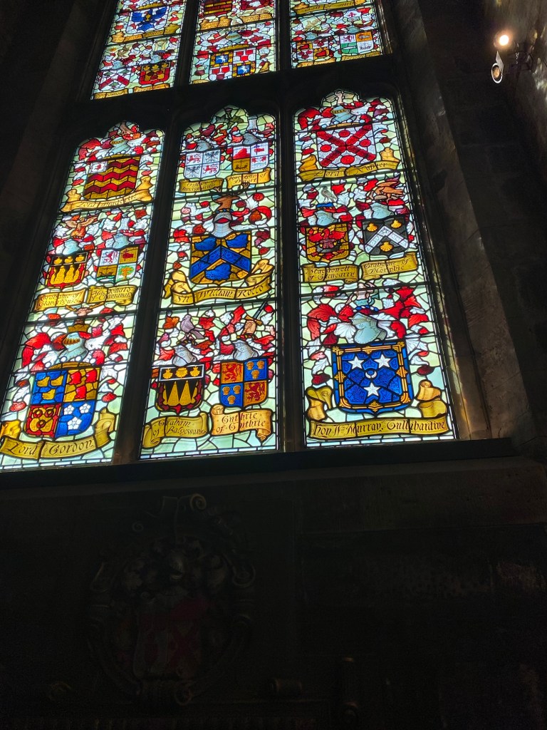 I was amused by the story of Jenny Geddes, the woman who threw a stool at the head of a St. Giles’ minister, in protest of the attempted Anglican-izing of the Scottish church. I was in awe of the Thistle Chapel, where the Order of the Thistle (the chivalrous organization headed by King Charles III) convenes. Hearing the significance of each of the seats and the decorative emblems chosen for the members of the Order was fascinating.