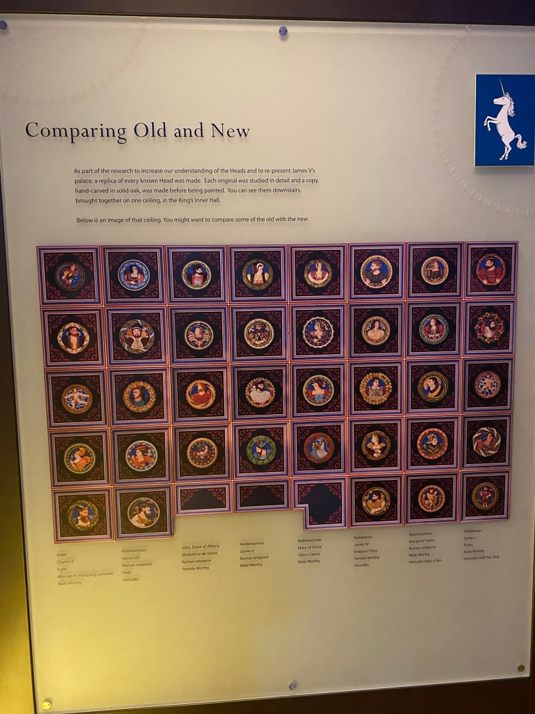 After visiting the distillery, we were off to Stirling Castle. This childhood home of Mary, Queen of Scots, was stately and picturesque. One of my favorite features, other than the meticulous grounds, was the Stirling Heads Gallery, a vast collection of oak carvings, both painted and plain, depicting some of the most prominent people of Scottish history. These nearly 500 year old portraits were originally used to decorate the ceiling of a room in Stirling Castle, but now they are on display for us to enjoy.