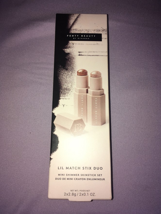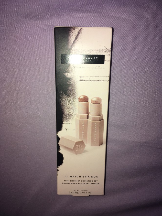However, the trip wasn’t in vain: I spotted some new Fenty Beauty products as I walked through the checkout line (I found some cute makeup brushes that I had to get). As it turns out, Fenty Beauty has designed some miniaturized versions of their popular products. I picked up the Lil Match Stix Duo Mini Shimmer Skinstick Set to try out some new shimmer skinstick shades.