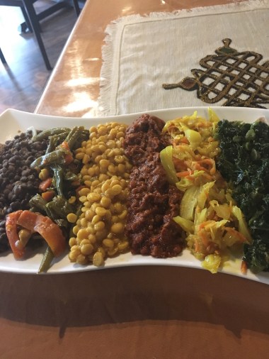 Awaze Ethiopian Eritrean Restaurant sits unassumingly in a strip mall. Its simple storefront doesn’t begin to capture the deliciousness that lurks inside. I was greeted by a friendly young man and was seated immediately. I ordered the veggie platter, which, according to the menu, had 4 different vegetable sides. My order arrived quickly and everything looked delicious. To my surprise, there were actually SIX sides on the platter. I was delighted!