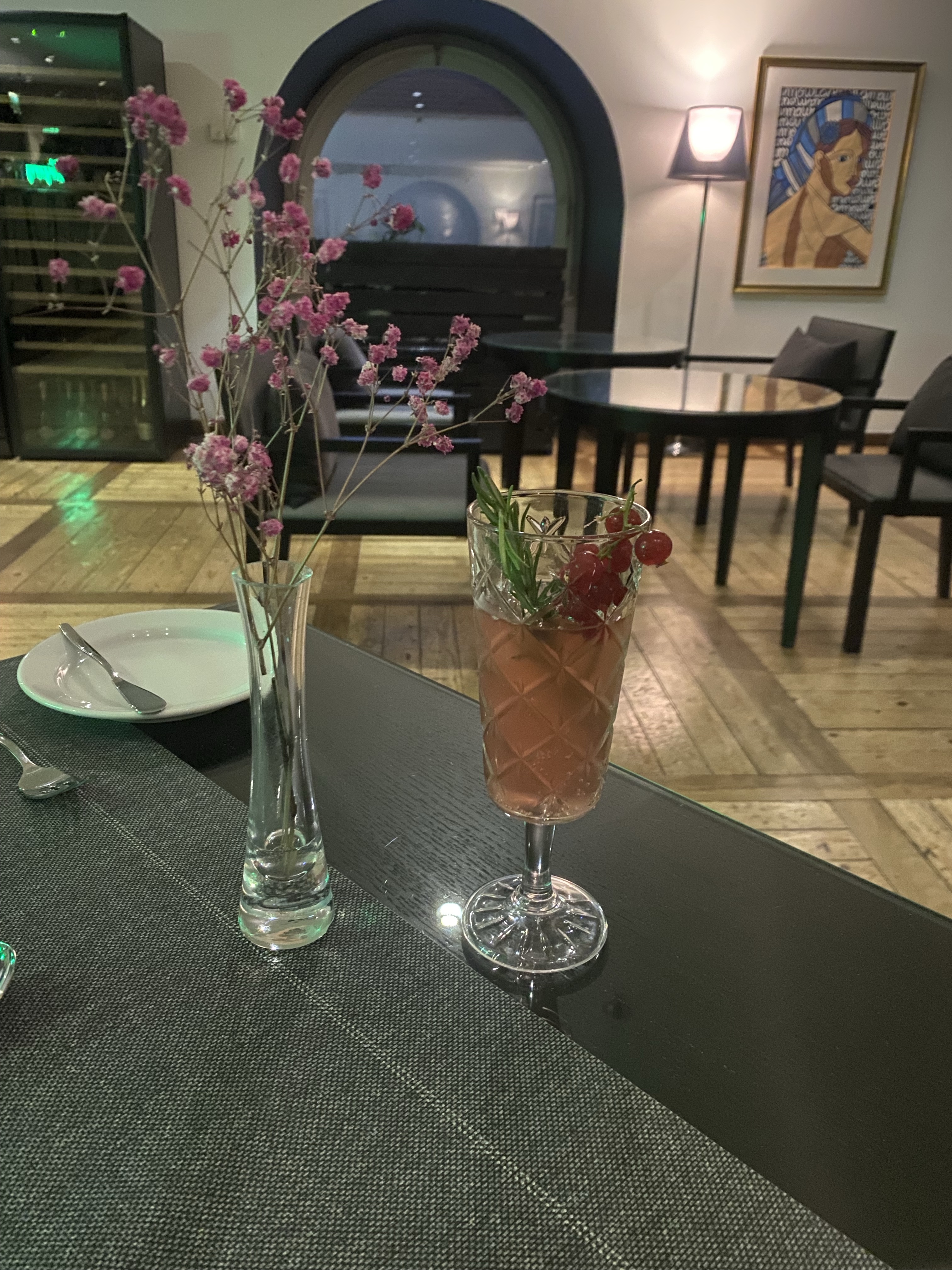 The experience started with us being seated in a lovely room that was a bit further back from the main entrance. Our space was punctuated with a grand Christmas tree that was white with silver accents. The room itself was a deep teal color, with light multicolored wooden floors and gold accents upon the walls. As we took in the beauty of our space, we were greeted by our waiter, who brought us menus and filled our water glasses.