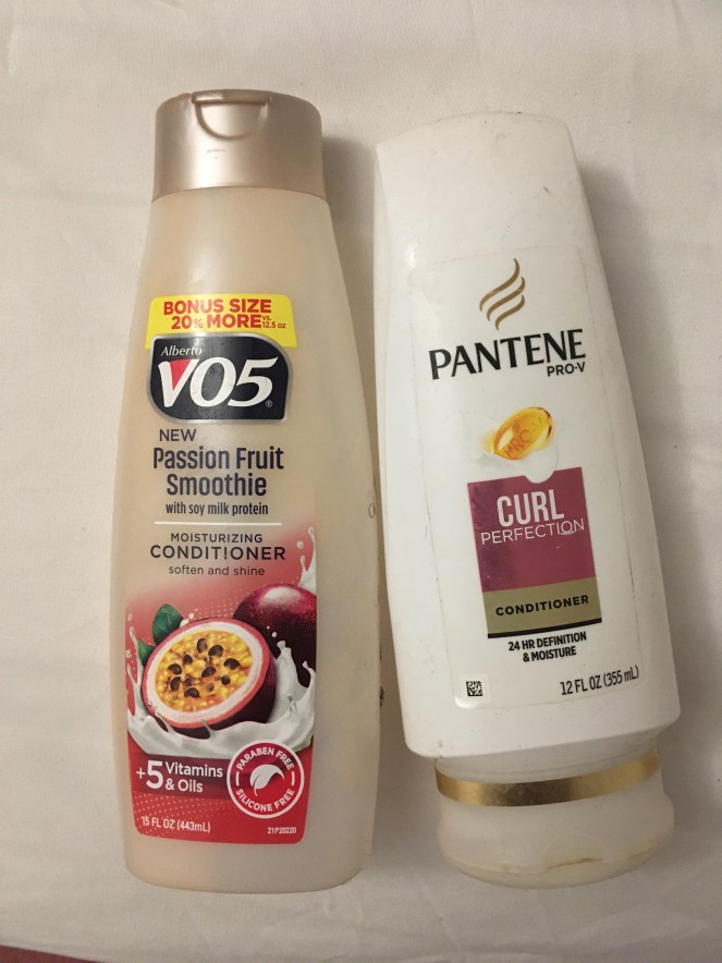 Now onto hair care. The funny part of my hair care is that it’s minimal at best: I don’t spend a lot of time on my hair, though I anticipate that will change in the upcoming months. I use these very inexpensive conditioners to detangle my hair prior to shampooing. My hair is kinky/curly so I use a lot of product to detangle and moisturize. VO5 and Pantene are low-priced so I don’t mind being a little “heavy-handed” when applying. When I’m running low on deep conditioner, I will use the Pantene to help “stretch” the product.