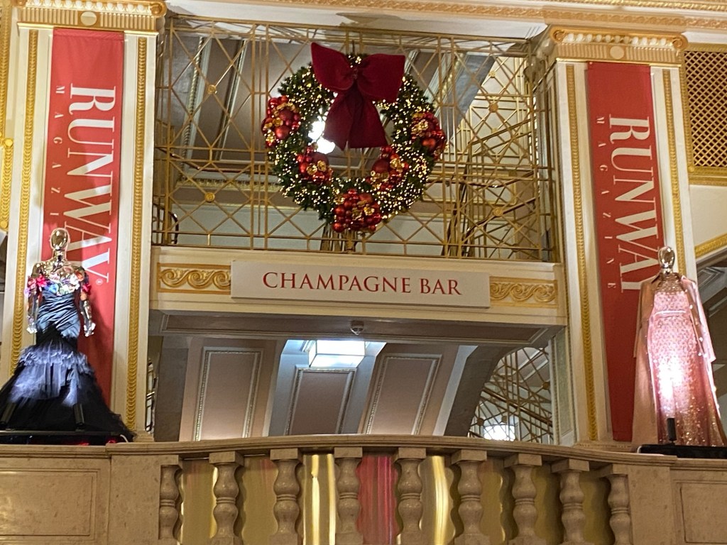 The experience started with us being seated in a lovely room that was a bit further back from the main entrance. Our space was punctuated with a grand Christmas tree that was white with silver accents. The room itself was a deep teal color, with light multicolored wooden floors and gold accents upon the walls. As we took in the beauty of our space, we were greeted by our waiter, who brought us menus and filled our water glasses.